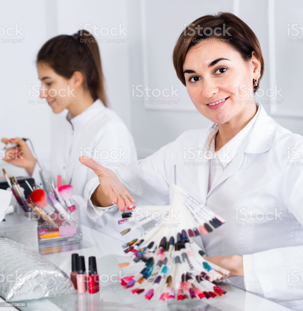 Pleasant diligent friendly female manicurist showing lacquer color schemes in nail salon