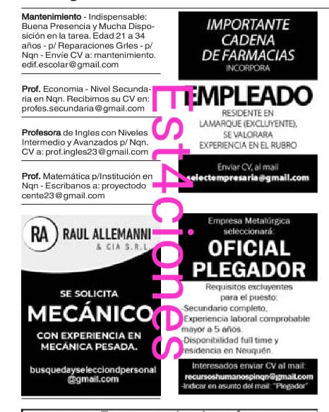 Clasificados 07/08. Petroleros. Adm. Técnic@s. Comercio. Gastronomía. Maestranza. Mtto. Salud. Etc. Envíar CV en PDF.